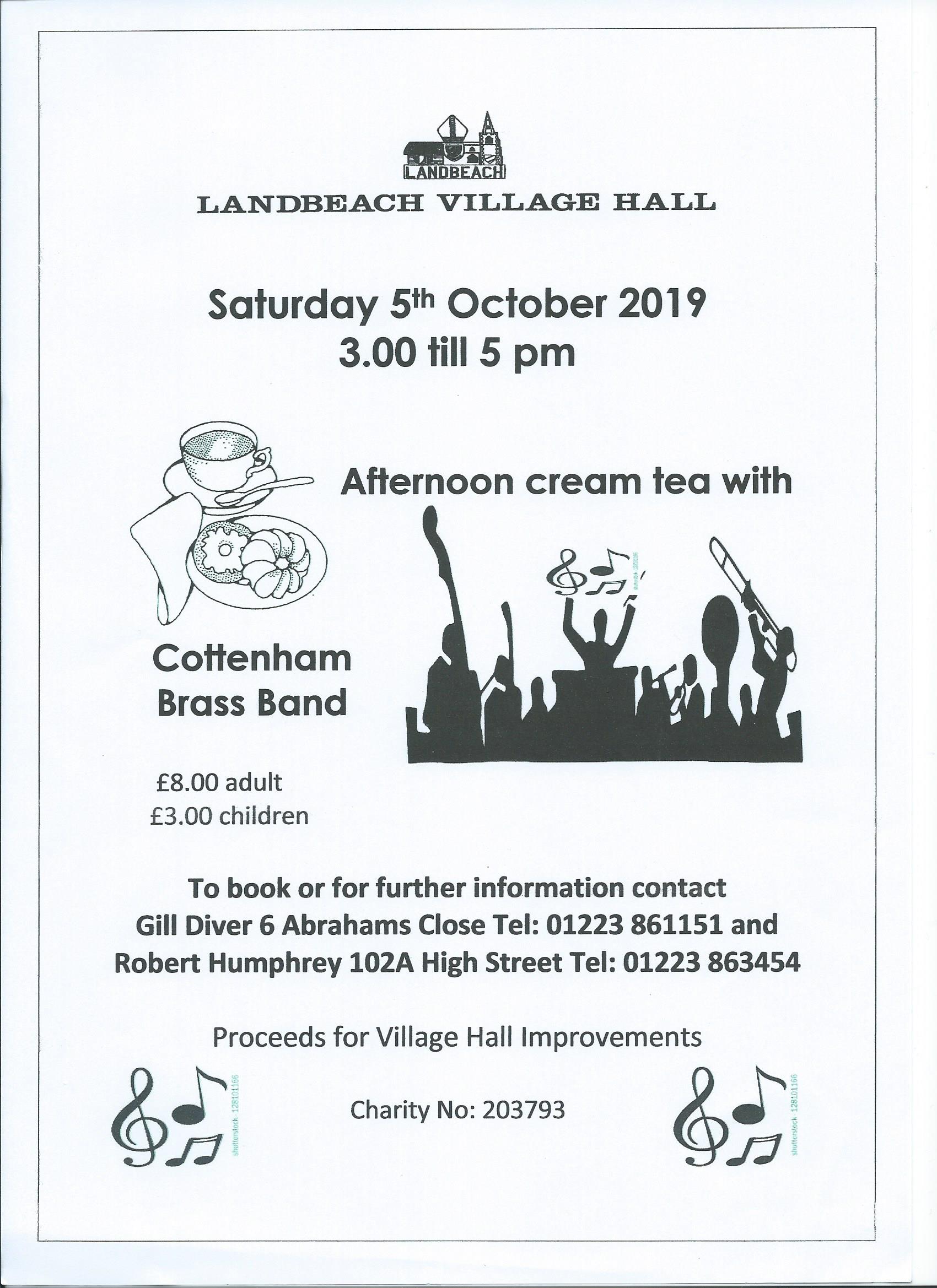 - Saturday, 5th October, 3.00pm-5.15pm, Landbeach Concert Concert at the Village Hall in return for band storage space.